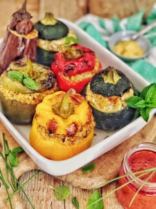 - Rangez-les farcis bien serrés dans le plat à four, arrosez du reste d’huile et remettez les chapeaux des légumes. Versez 10 cl d’eau et enfournez pour environ 45 minutes. Servez chaud, tiède ou à température ambiante.